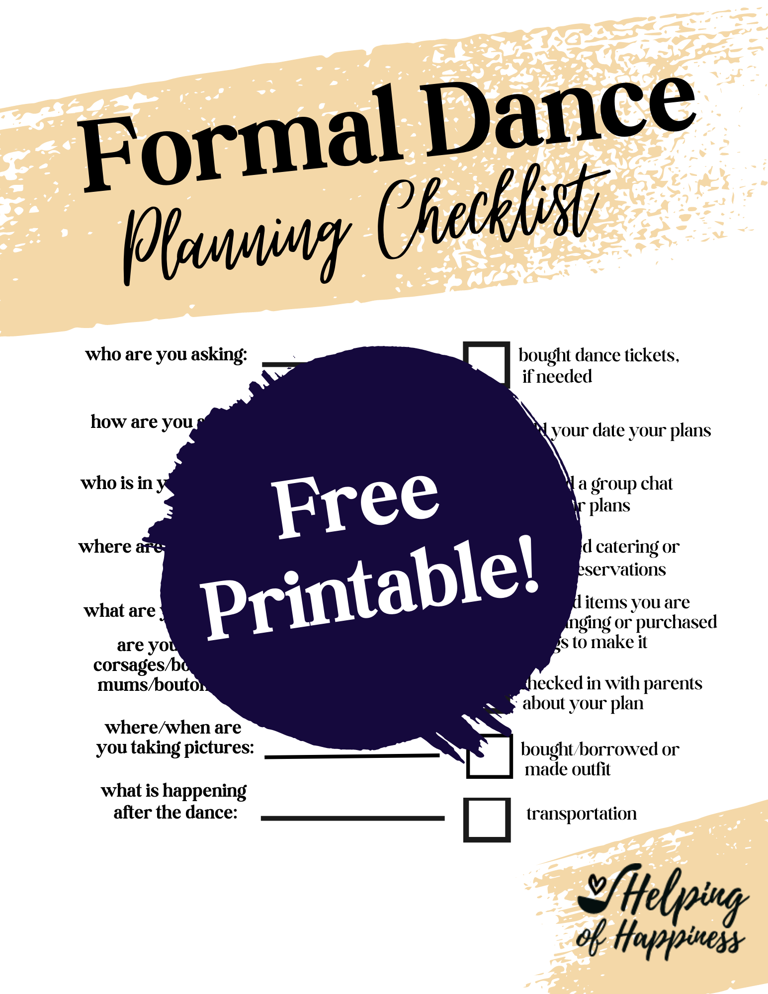 Grab the formal dance printable. It’s in our Freebie Library > Special Occasions > Formal Dance Planning Checklist.